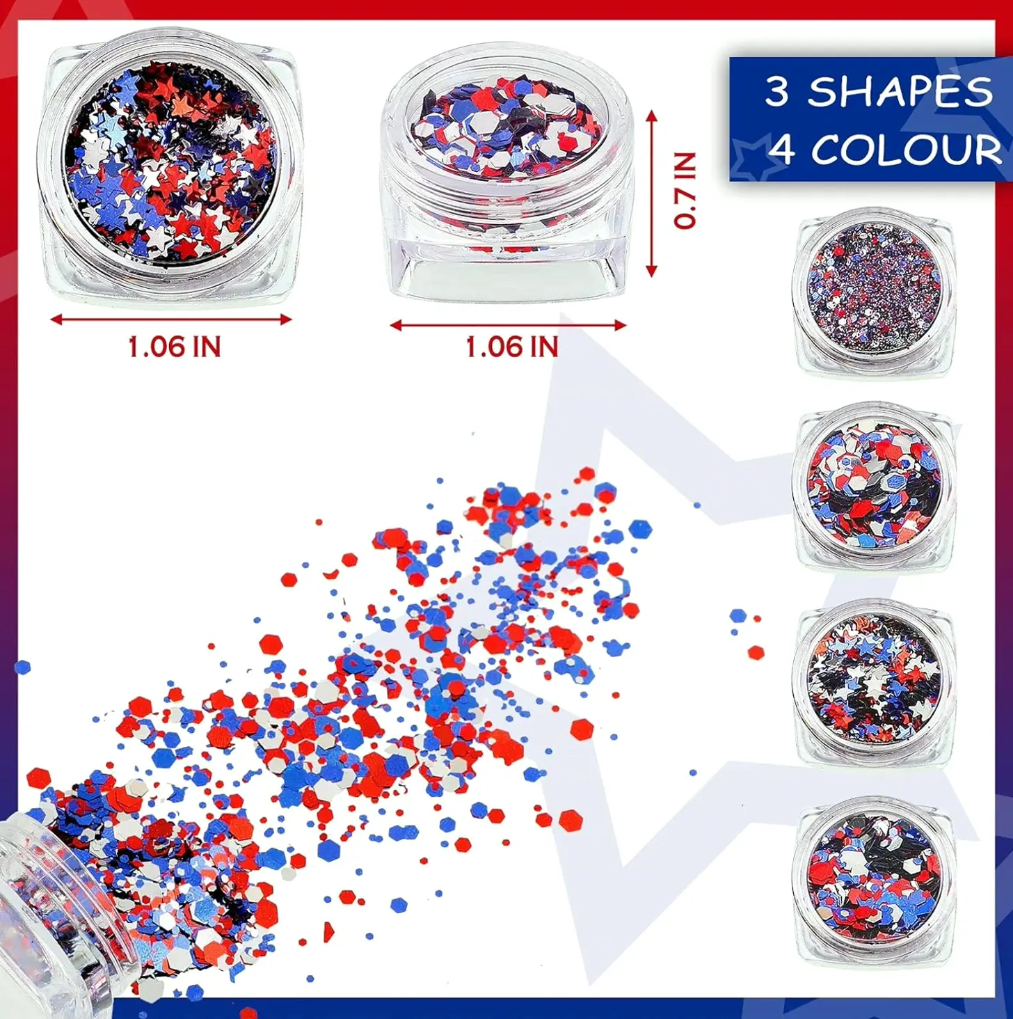 Sufficient amount: the set contains 12 mini containers of Independence Day star nail sequins in various colors, including ruby, blue, argent, sufficient quantity and vibrant colors to meet your manicure holiday adornment needs, making your nails more stylish