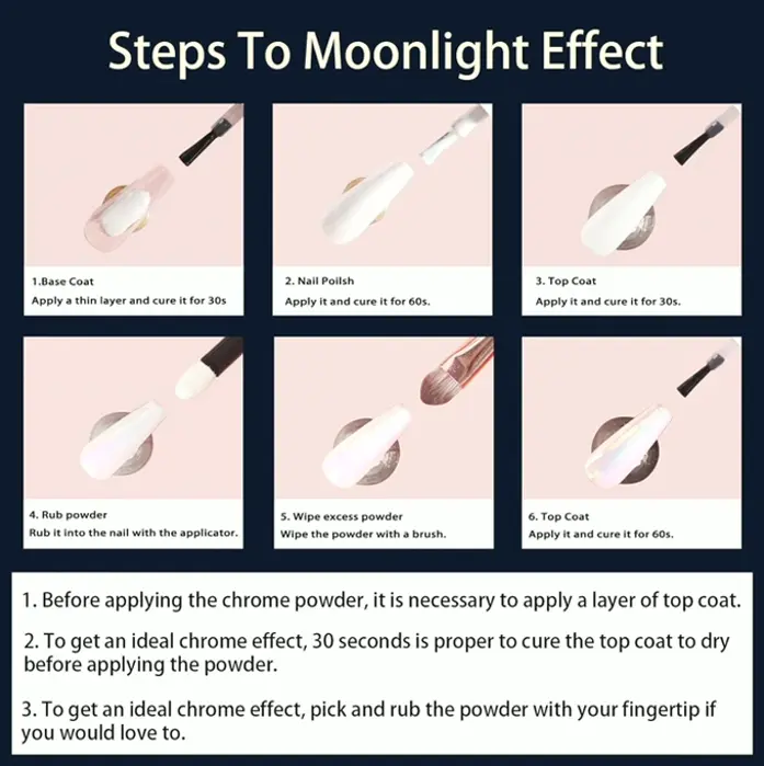 Easy to Use: It is easy for chrome dust to create beautiful metallic effects. You easily professional results. Just need some gel, some nail top coat, and aurora dust. To make it easy to use the dust, we include detailed steps in the images.
