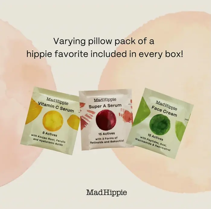 VITAMIN C SERUM FOR SKIN: Tighten, brighten, and soften aging, acne-prone, or sun-damaged complexion with an award-winning Vitamin C face elixir. A assorted pillow pack is inside every box. UNIQUE VITAMIN C SKIN CARE: Our age-defying serum features a consistent, non-oxidizing, and mild version of Vitamin C with a natural yellow tint that restores and soothes skin without irritation. HYDRATING SERUM: Mad Hippie Vitamin C serum with skin-plumping hyaluronic acid is formulated with Vitamin E and Ferulic Element for a compounding antioxidant effect. SERUM FOR GLOWING SKIN: Improves skin feel while minimizing the visibility of fine lines, creases, uneven tone, and dark spots caused by scarring. NATURAL DERMAL CARE: Mad Hippie produces non-GMO, cruelty-free, and vegan skincare solutions that enhance your skin through the strength of nature.