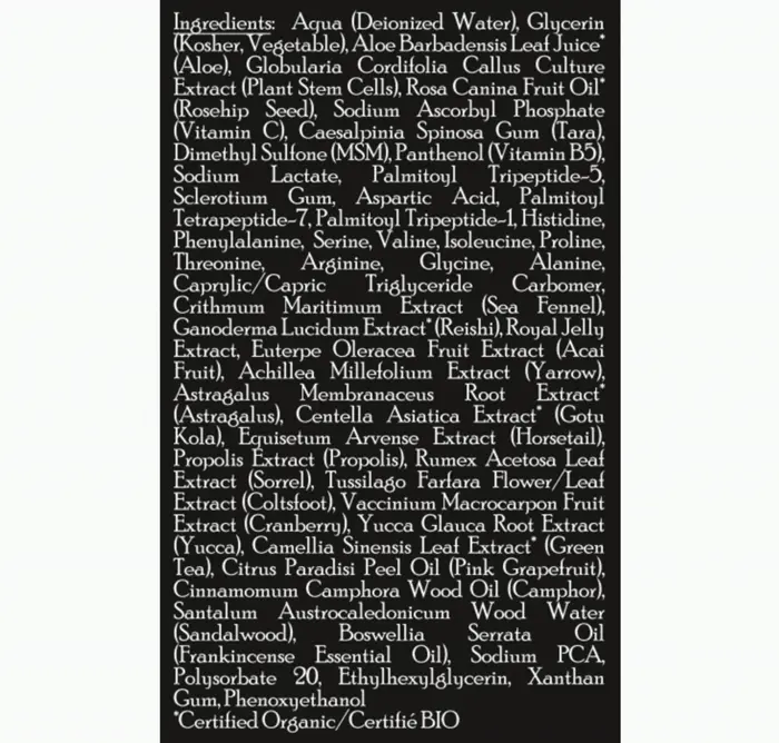 Key Components: Pure and Certified Organic ingredients, featuring hyaluronic acid, protein peptides, and Vit C in this men’s serum.
