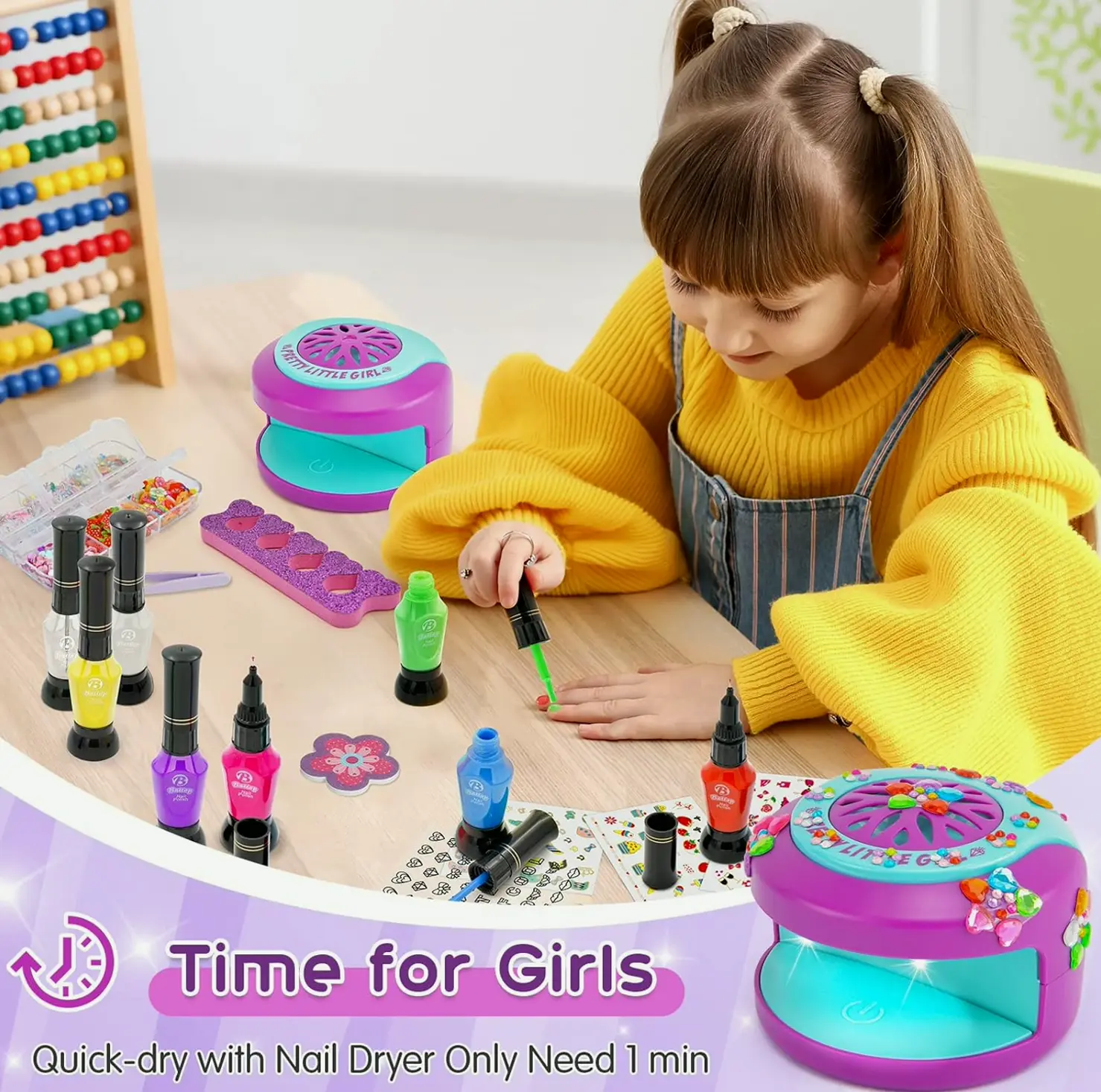 This complete manicure set includes 8 fashionable polish colors, glittering 3D jewelry, and nail stickers. It features a real nail blower for quick drying. The kit makes for painting, doodling, decorating, finishing & drying manicures. Perfect for a manicure party! The gem dryer guarantees quick drying without any worry of messing clothes, walls. Requires three AAA batteries (not included). The two-in-one nail polish pen allows for polishing with the brushes and doodling with the fine tip. Ideal for creating personalized designs with friends. Great present for girls who enjoy dress-up. 100% satisfaction guaranteed, with full refund if not satisfied.