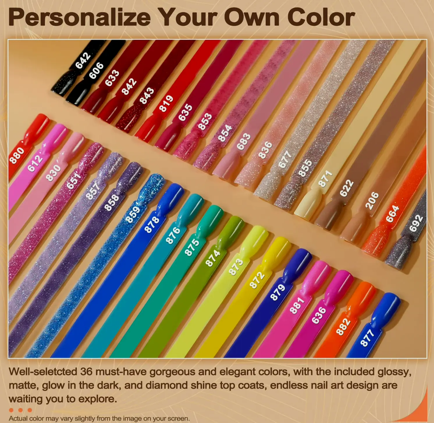 What You Get: 36 Small Nail shades (5ml.), two Foundation Layers; one Shiny Top Coat; a single Matte Top Coat; a single Glow-in-the-Dark Top Coat, and a single Diamond Top Coat (8ml.). The itty-bitty gel containers are perfect for your travels. Ideal nail art present for any holiday or celebration, this unique gift set will be appreciated by all. Flawless Four-in-One Top Coats: Choose among shiny, velvety, luminous, and diamond finishes to personalize your nails. Highly Pigmented 36 Colors: Intense gel shades, suitable for any skin tones, perfectly complement any outfit. Durable and Simple Use: Simple to apply without bubbles, lasts up to 14+ days, cure under UV/LED light. Non-toxic Formula: ‘Free from formaldehyde, toluene, DBP’, low smell, never tested on animals; Safe to use. 30-Day Return/Refund Policy: Email customer service if unsatisfied.