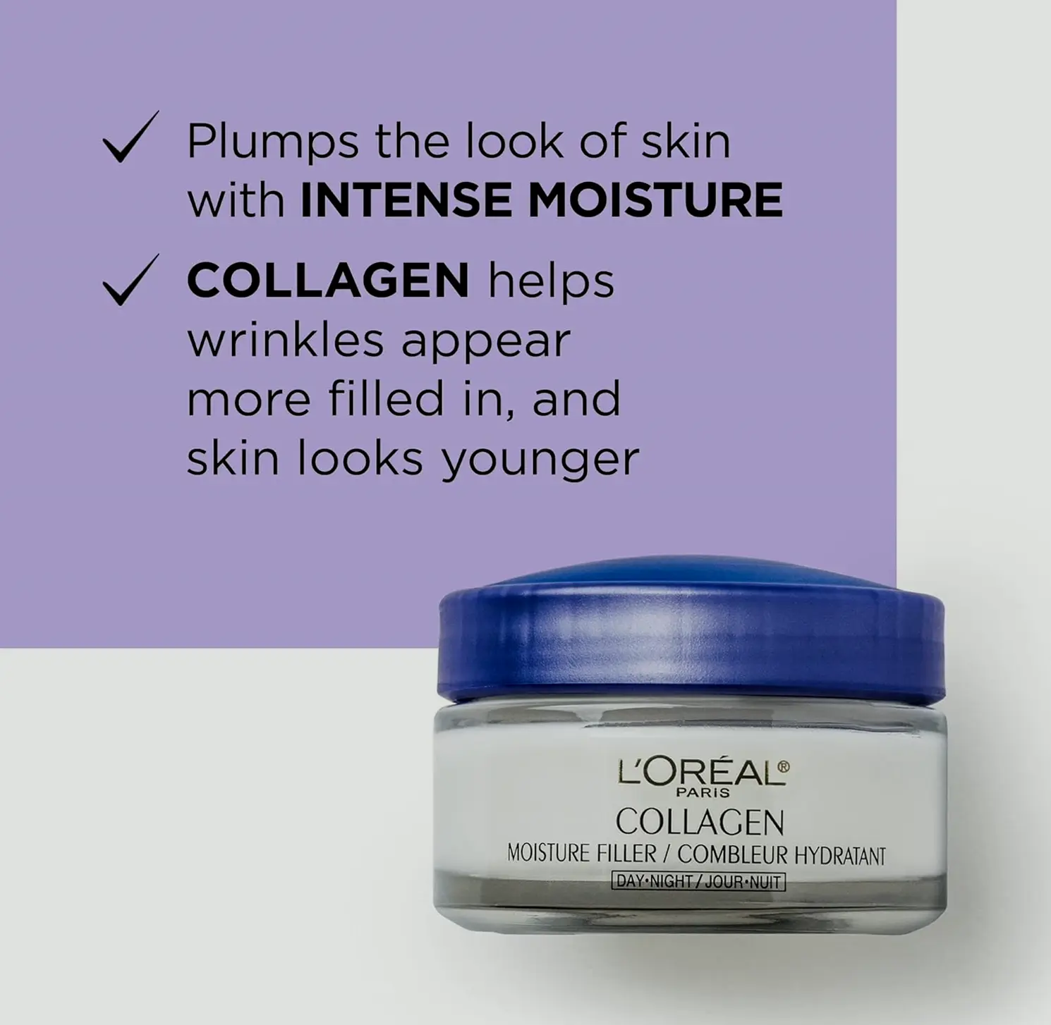 Daily and night facial and neck cream: provides skin with a daily dose of intense hydration that helps fill the appearance of lines and creases and helps restore hydration for softer, fuller skin. This gentle, non-greasy moisturizer provides hydration to all skin types, including delicate skin and absorbs rapidly without leaving a sticky film, for smoother, rejuvenated, youthful skin. Proven results: In a night, skin is revitalized with moisture; After one week of using this face cream skin feels smoother and in 4 weeks of application, wrinkles appear more filled in. Revitalize skin with Collagen: Gift your skin a everyday dose of hydration from L’Oreal Paris anti-aging skin care, whether face lotion, evening eye treatments, or sunscreens with SPF, they provide your skin essential moisture to retain skin healthy. Kickstart your skincare regime; To begin, cleanse with Revitalift Derm Intensives 3.5 percent Pure Glycolic Acid Gel Facial Cleanser, treat under eye with Eye Defense Eye Cream and hydrate day and evening with Collagen Moisture Filler Moisturizer.