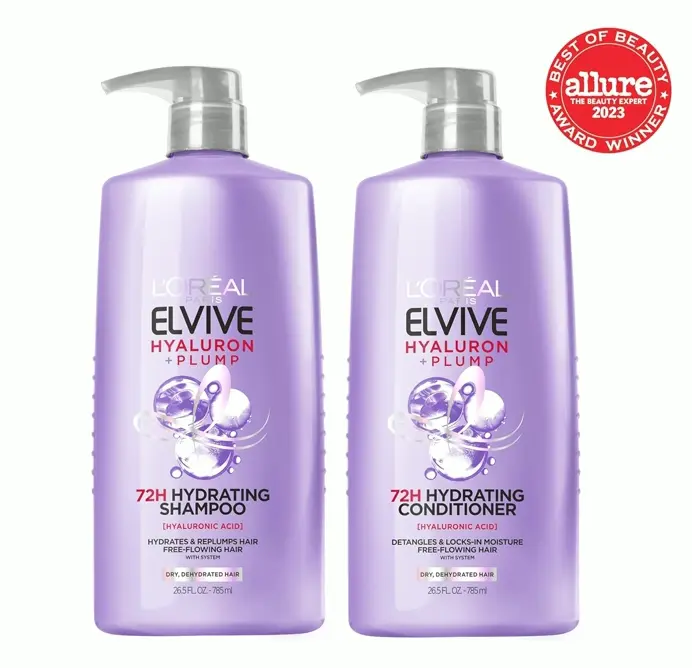 Enjoy 72H Intense Hydration: Hyaluron Plump Shampoo and Conditioner Kit cleanses and detangles while instantly moisturizing for bouncy, free-flowing locks.