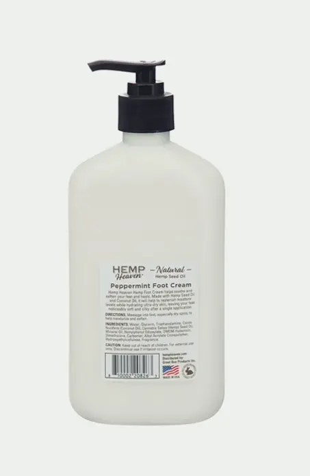 Nourishing Foot Cream: Brand Mint Foot Cream is infused with Hemp Seed Oil to help moisturizing, calming, and rejuvenating rough, damaged feet. Comforting Foot Therapy: The refreshing and stimulating peppermint scent provides a spa-like sensation. Deep Moisturization: The luxurious and creamy formula deeply penetrates to soothe and repair damaged skin, leaving your feet feel smooth, refreshed, and revitalized. American Made: Hemp Heaven products are proudly made in California.