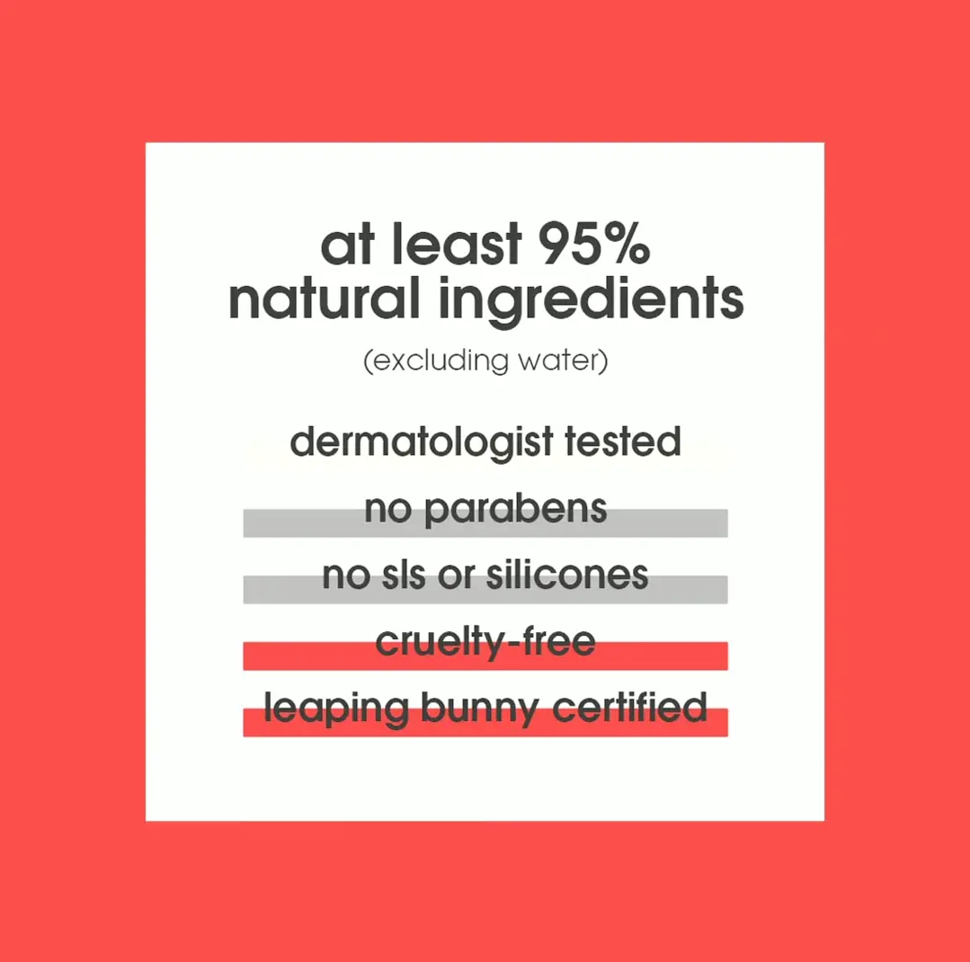 Mostly Natural for conscious skincare. Without Parabens, SLS, and Silicones. Cruelty-Free & Leaping Bunny Certified for animal welfare.