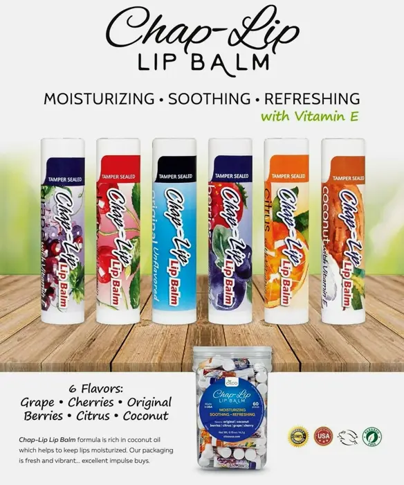 Savor a variety of 6 invigorating flavors: Grape, Cherries, Original, Berries, Citrus, Coconut. These tastes help moisturizing and comforting your lips. Our lip treatments don’t leave a thick film and apply smooth. Rich in coco oil, it nourishes and shields chapped lips. Vit E helps calming and locking in moisture, protecting against environmental stressors and UV rays. Manufactured in the USA, paraben-free, animal-friendly, and ideal for sensitive lips.
