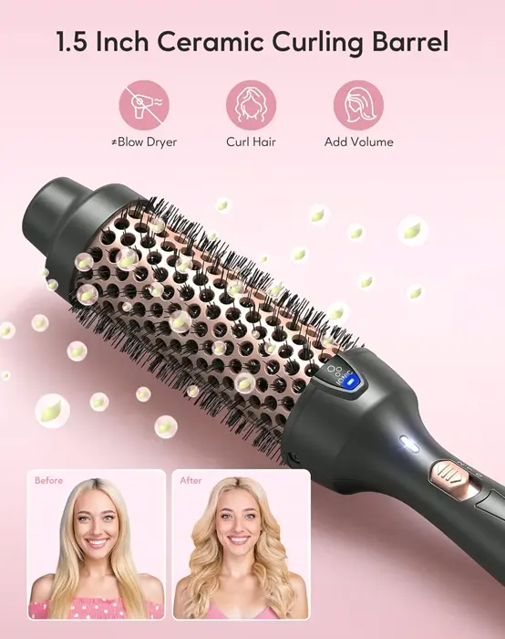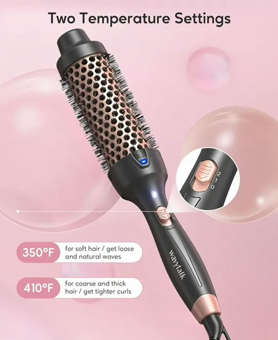 Get Blowout Styles & Effortless Curls – WaveTalk 1.5 inch heated brush with a ceramic barrel heats evenly for medium to loose curls. It’s not a blow dryer; it’s a heated brush. Get volume and blowout look effortlessly. Ideal for medium-length hair, not recommended for short hair. Achieve natural and voluminous curls with this. Negative Ion Function – Equipped with negative ion function, our heated brush touches each hair with ions, locking moisture, smoothing hair, and cutting frizz. Effortlessly create long-lasting and lovely curls. Two Temperature Settings – 350℉ for thin or soft locks; 410℉ for dense or stiff hair. Extend time depending on hair type. Our universal voltage curling iron with many settings gives you control to prevent damage. Faster Styling – Wavytalk hot styling brush simplifies the process and allows quick curling, saving effort. Simplified usage: Using the curling iron brush removes the need for extra tools like combs or clips, making the process convenient. Easier To Use – Wrap hair directly on the barrel and comb downward to achieve loose curls. No expertise required. International voltage ready, it’s perfect for travel.